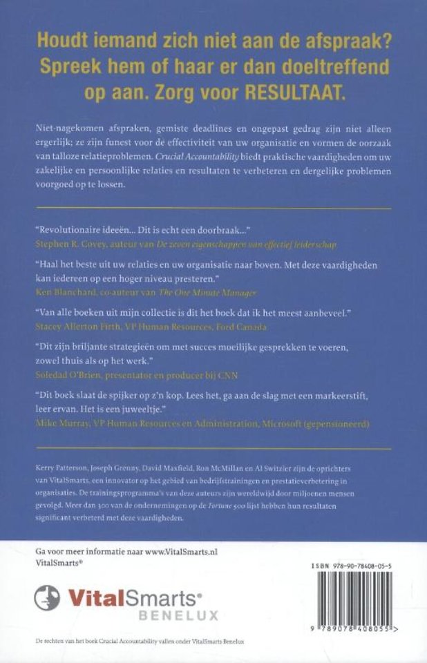 Kerry Patterson, Jospeh Grenny, Ron McMillan en Al Switzler zijn de oprichters van VitalSmarts en internationaal erkend vanwege hun grensverleggende werk op het gebied van organisatiekunde en management.