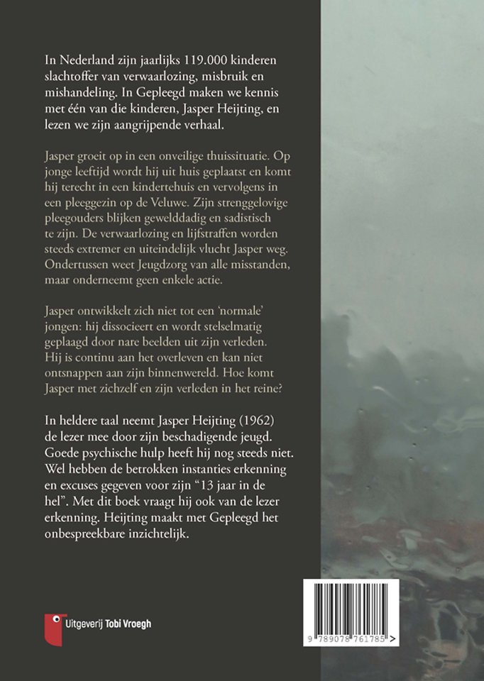 In Nederland zijn jaarlijks 119.000 kinderen slachtoffer van verwaarlozing, misbruik en mishandeling. In Gepleegd maken we kennis met een van die kinderen, Jasper Heijting, en lezen we zijn aangrijpende verhaal.