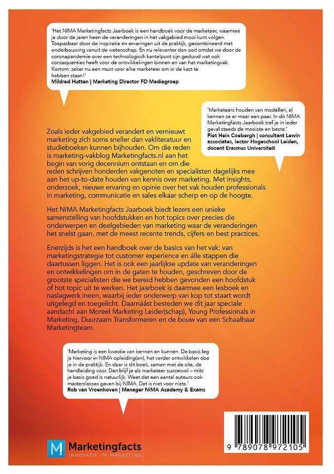 Met insights, onderzoek, nieuwe ervaring en opinie over het vak houden professionals in marketing, communicatie en sales elkaar scherp en op de hoogte. Het NIMA 'Marketingfacts Jaarboek' biedt lezers een unieke samenstelling van hoofdstukken en hot topics over precies die onderwerpen en deelgebieden van marketing waar de veranderingen het snelst gaan, met de meest recente trends, cijfers en best practices.