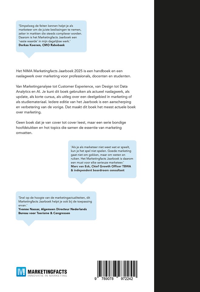 Het NIMA Marketingfacts Jaarboek 2025 is een handboek en een naslagwerk over marketing voor professionals, docenten en studenten. Van Marketinganalyse tot Customer Experience, van Design tot Data Analytics en AI.