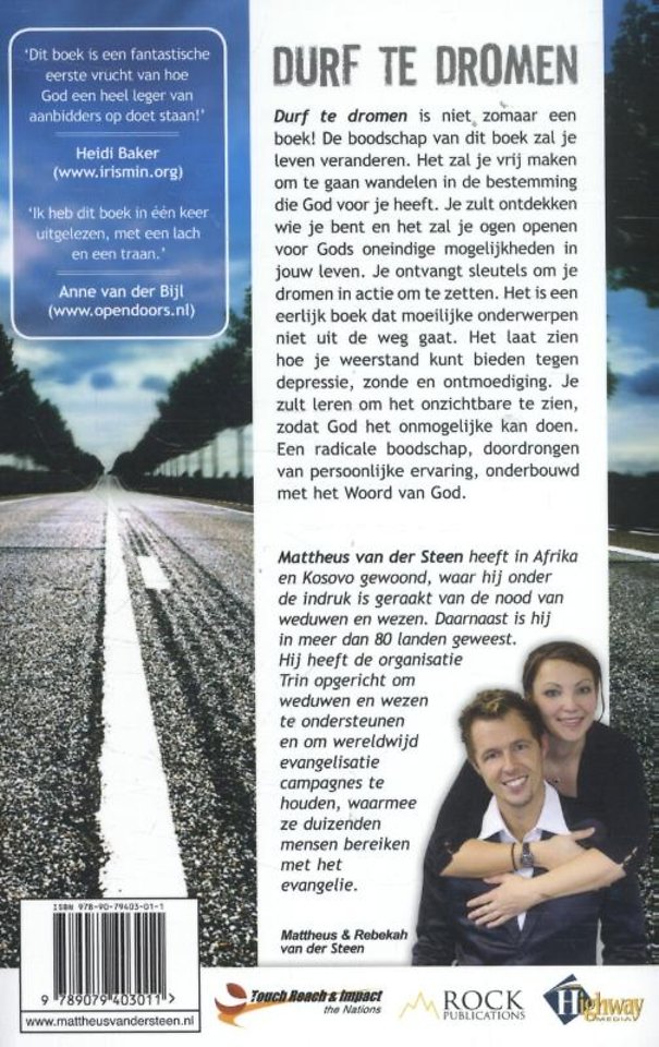Durf te dromen is het persoonlijke verhaal van een jonge Nederlander, Mattheus van der Steen, die zijn dromen najaagt en God op een geweldige manier ziet werken. Het is ook een eerlijk boek dat moeilijke onderwerpen niet uit de weg gaat. Het laat zien hoe je weerstand kunt bieden tegen depressie, zonde en ontmoediging. Je zult leren om het onzichtbare te zien, zodat God het onmogelijke kan doen. Een radicale boodschap, doordrongen van persoonlijke ervaring. Je ontvangt sleutels om je dromen in actie om te zetten en te gaan wandelen in de bestemming die God voor je heeft. Je zult ontdekken wie je bent en het zal je ogen openen voor Gods mogelijkheden in jouw leven.