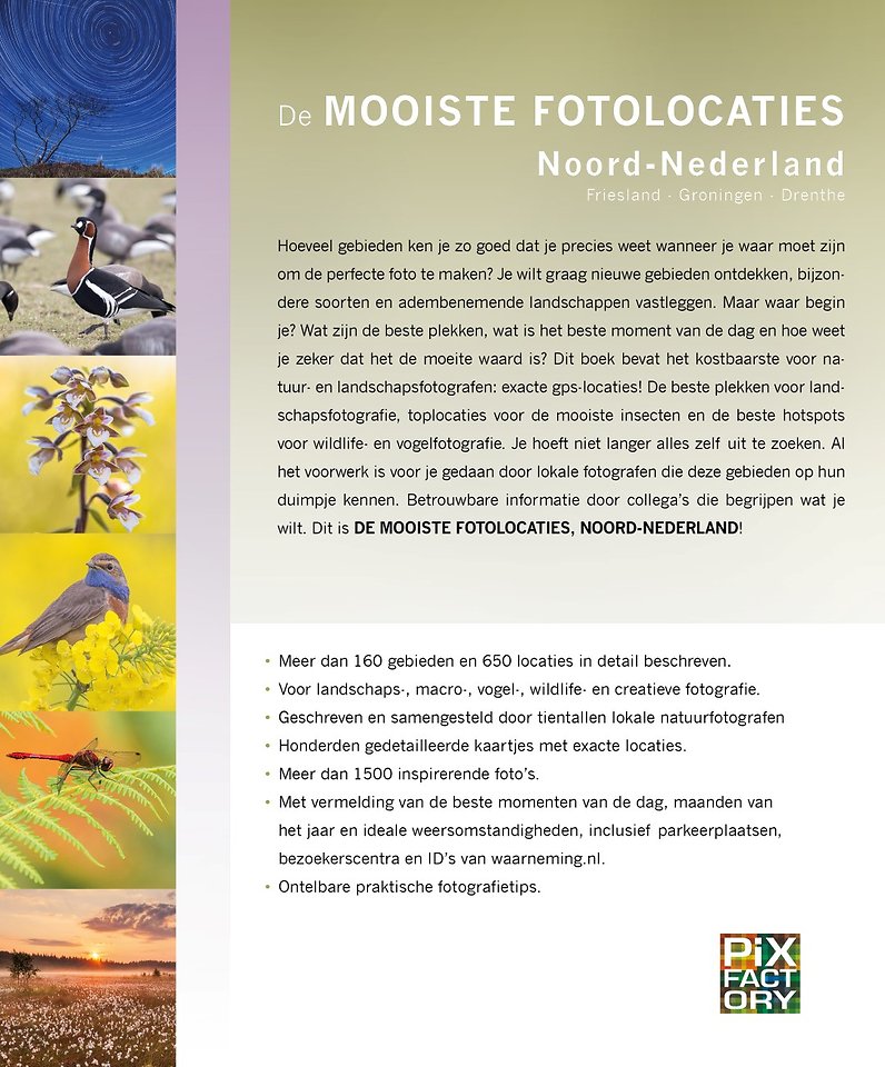 Hoeveel gebieden ken je zo goed dat je precies weet wanneer je waar moet zijn om de perfecte foto te maken? Je wilt graag nieuwe gebieden ontdekken, bijzondere soorten en adembenemende landschappen vastleggen. Maar waar begin je? Wat zijn de beste plekken, wat is het beste moment van de dag en hoe weet je zeker dat het de moeite waard is? Dit boek bevat het kostbaarste voor natuur- en landschapsfotografen: exacte gps-locaties! De beste plekken voor landschapsfotografie, toplocaties voor de mooiste insecten en de beste hotspots voor wildlife- en vogelfotografie. Je hoeft niet langer alles zelf uit te zoeken. Al het voorwerk is voor je gedaan door lokale fotografen die deze gebieden op hun duimpje kennen. Betrouwbare informatie door collega’s die begrijpen wat je wilt. Dit is DE MOOISTE FOTOLOCATIES, NOORD-NEDERLAND!