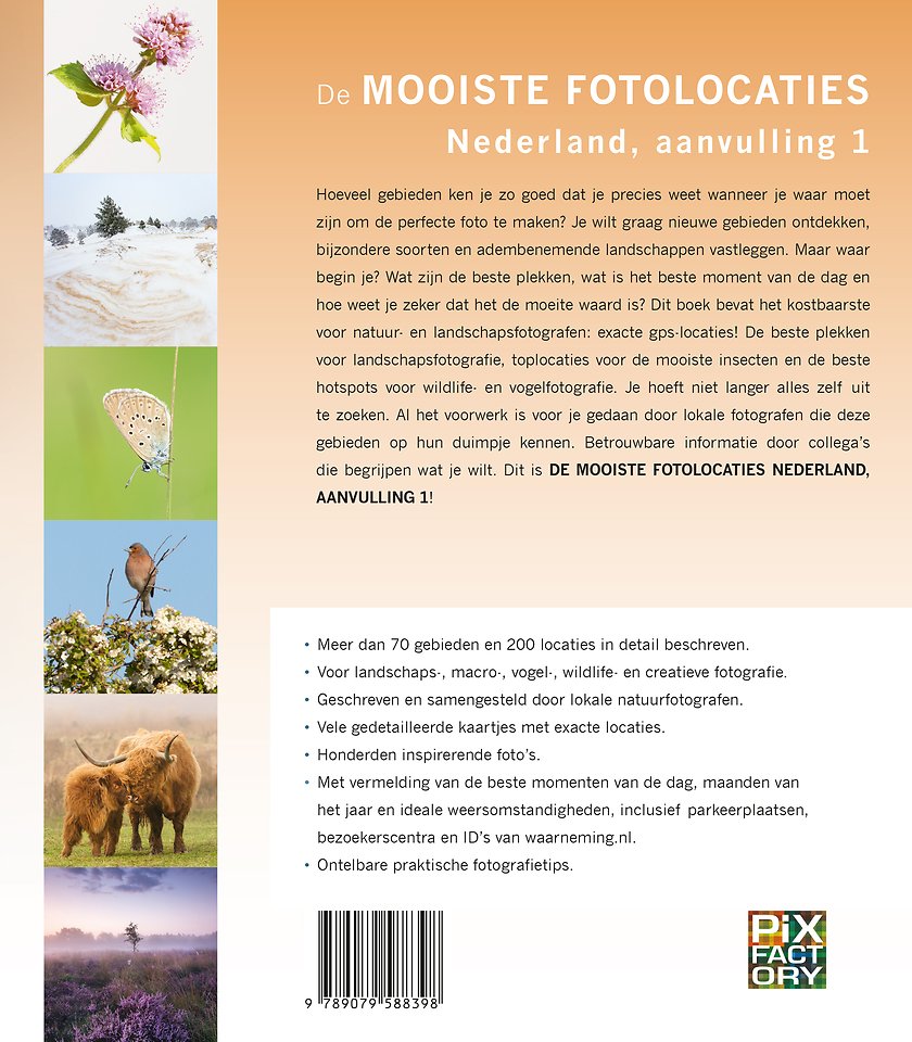 Hoeveel gebieden ken je zo goed dat je precies weet wanneer je waar moet zijn om de perfecte foto te maken? Je wilt graag nieuwe gebieden ontdekken, bijzondere soorten en adembenemende landschappen vastleggen. Maar waar begin je? Wat zijn de beste plekken, wat is het beste moment van de dag en hoe weet je zeker dat het de moeite waard is? Dit boek bevat het kostbaarste voor natuur- en landschapsfotografen: exacte gps-locaties! De beste plekken voor landschapsfotografie, toplocaties voor de mooiste insecten en de beste hotspots voor wildlife- en vogelfotografie. Je hoeft niet langer alles zelf uit te zoeken. Al het voorwerk is voor je gedaan door lokale fotografen die deze gebieden op hun duimpje kennen. Betrouwbare informatie door collega’s die begrijpen wat je wilt. Dit is DE MOOISTE FOTOLOCATIES NEDERLAND, AANVULLING 1!