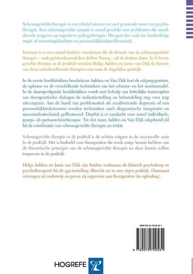Intussen is er een aantal boeken verschenen die de theorie van de schemagerichte therapie - zoals geïntroduceerd door Jeffrey Young - uit de doeken doen. In Schemagerichte therapie in de praktijk vertalen Helga Aalders en Janie van Dijk de theorie van deze indrukwekkende therapievorm naar de dagelijkse praktijk.