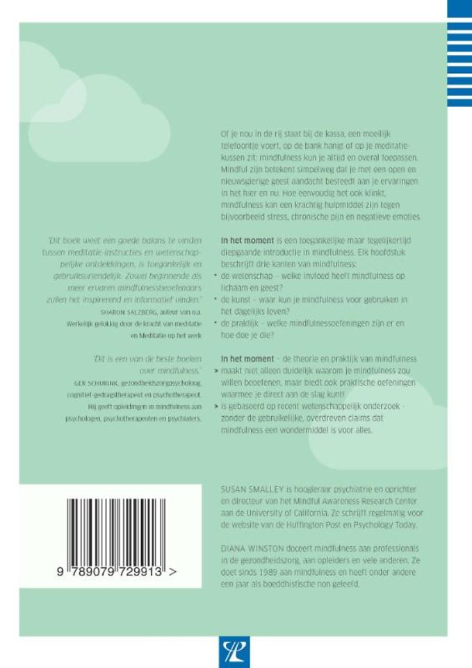 Of je nou in de rij staat bij de kassa, een moeilijk telefoontje voert, op de bank hangt of op je meditatiekussen zit: mindfulness kun je altijd en overal toepassen. Mindful zijn betekent simpelweg dat je met een open en nieuwsgierige geest aandacht besteedt aan je ervaringen in het hier en nu. Hoe eenvoudig het ook klinkt, mindfulness kan een krachtig hulpmiddel zijn tegen bijvoorbeeld stress, chronische pijn en negatieve emoties. IN HET MOMENT is een toegankelijke maar tegelijkertijd diepgaande introductie in mindfulness. Elk hoofdstuk beschrijft drie kanten van mindfulness: