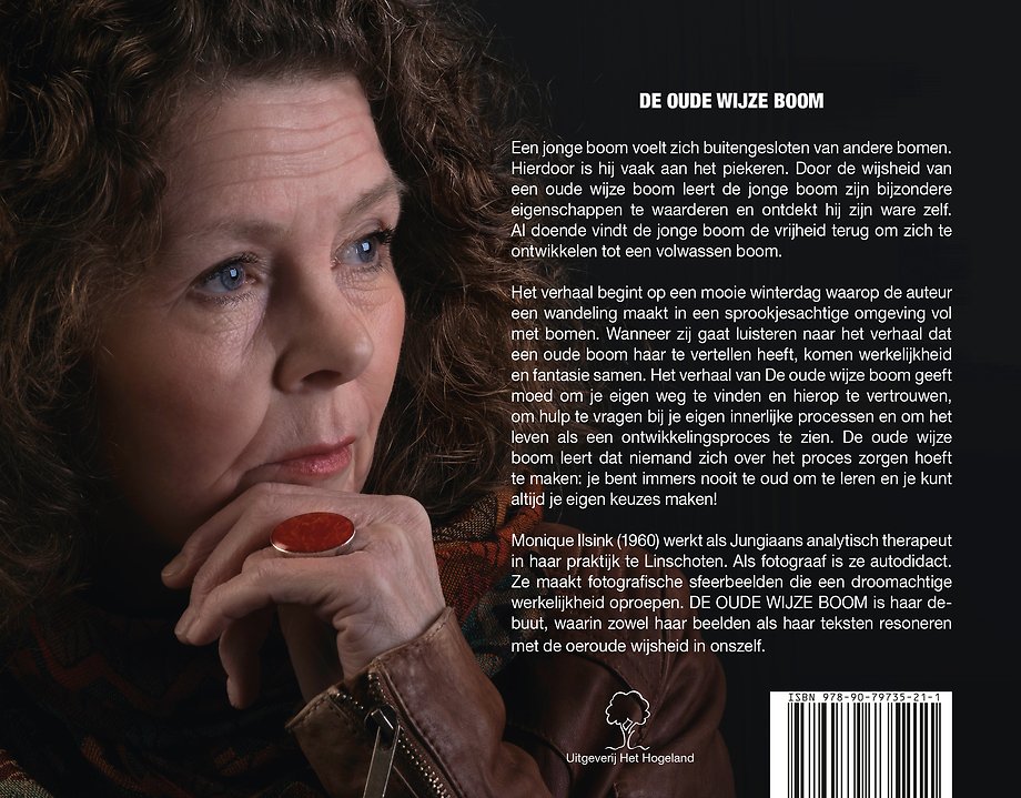 Monique Ilsink (1960) werkt als Jungiaans analytisch therapeut in haar praktijk te Linschoten. Als fotograaf is ze autodidact. Ze maakt fotografische sfeerbeelden die een droomachtige werkelijkheid oproepen. DE OUDE WIJZE BOOM is haar debuut, waarin zowel haar beelden als haar teksten resoneren met de oeroude wijsheid in onszelf.