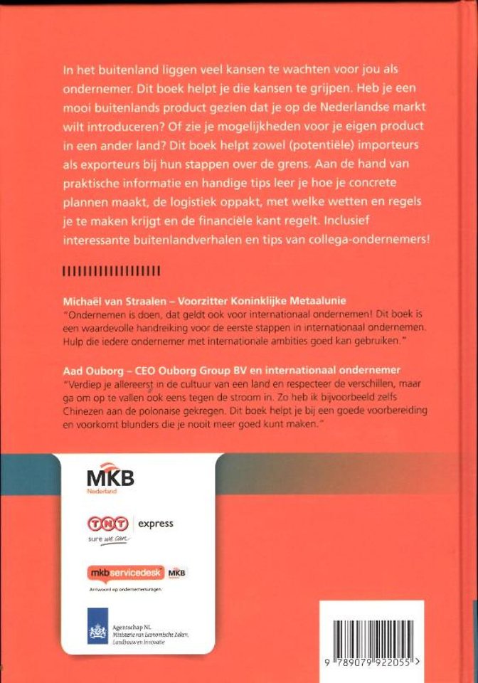 In het buitenland liggen veel kansen te wachten voor u als ondernemer. Dit boek helpt u die kansen te grijpen. Heeft u een mooi buitenlands product gezien dat u op de Nederlandse markt wilt introduceren? Of ziet u mogelijkheden voor uw eigen product in een ander land? Dit boek helpt zowel (potentiële) importeurs als exporteurs bij hun stappen over de grens. Aan de hand van praktische informatie en handige tips leert u hoe u concrete plannen maakt, de logistiek oppakt, met welke wetten en regels u te maken krijgt en de financiële kant regelt.