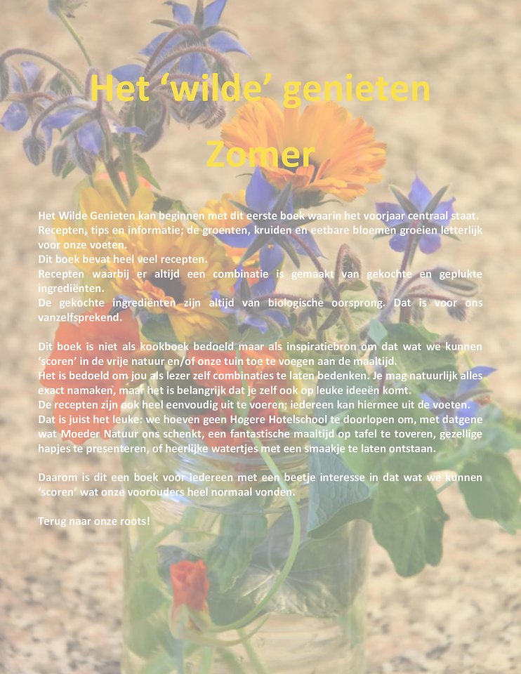Dit boek is niet als kookboek bedoeld maar als inspiratiebron om dat wat we kunnen ‘scoren’ in de vrije natuur en/of onze tuin toe te voegen aan de maaltijd.