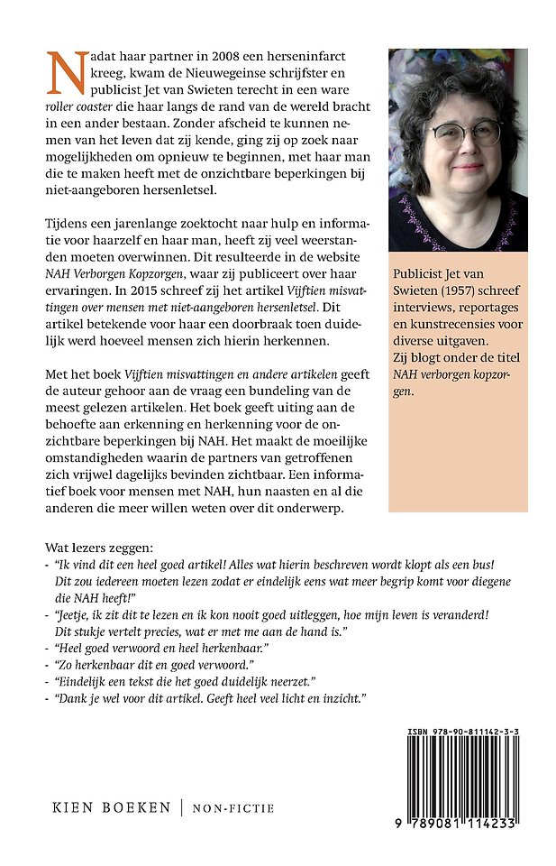 Met het boek Vijftien misvattingen en andere artikelen geeft de auteur gehoor aan de vraag om een aantal artikelen te bundelen. De artikelen geven uiting aan de wens van erkenning en herkenning voor de onzichtbare beperkingen bij NAH, en maken zichtbaar in welke moeilijke omstandigheden de partners van getroffenen zich vrijwel dagelijks bevinden. Een informatief boek voor mensen met NAH, hun naasten en al die anderen die meer willen weten over dit onderwerp.