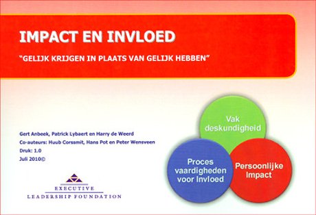 Als u uw persoonlijke invloed in uw organisatie wilt vergroten, dan biedt het boekje 'Impact en invloed, gelijk krijgen in plaats van gelijk hebben' een overzicht van een aantal bestaande beschikbare methoden en technieken die u hierbij kunt inzetten. Verwacht geen compleet uitgewerkt stappenplan van de heren Anbeek, Lybaert en De Weerd, maar maak kennis met mogelijke modellen, theorieën en samenvattingen die u kunt toepassen.