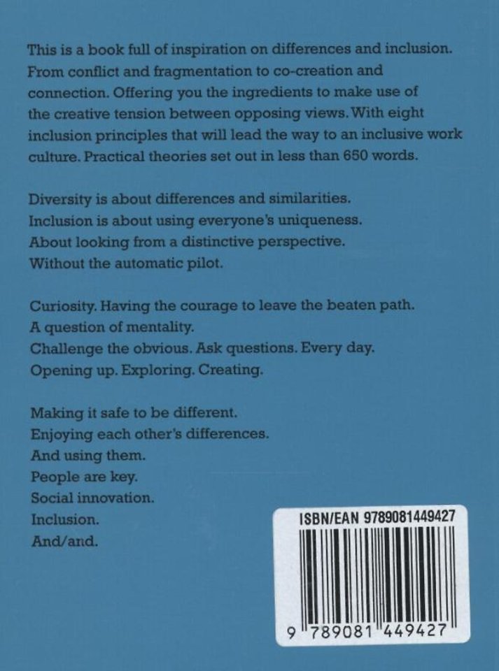 Dit is een veelzijdig boek vol inspiratie over verschillen. Met ingrediënten om de creatieve spanning tussen tegenstellingen te hanteren. Van beconcurreren en vechten naar co-creatie en verbinden. Met acht inclusie principes die leiden tot een open werkcultuur. Praktische theorieën uitgelegd in maximaal 650 woorden.