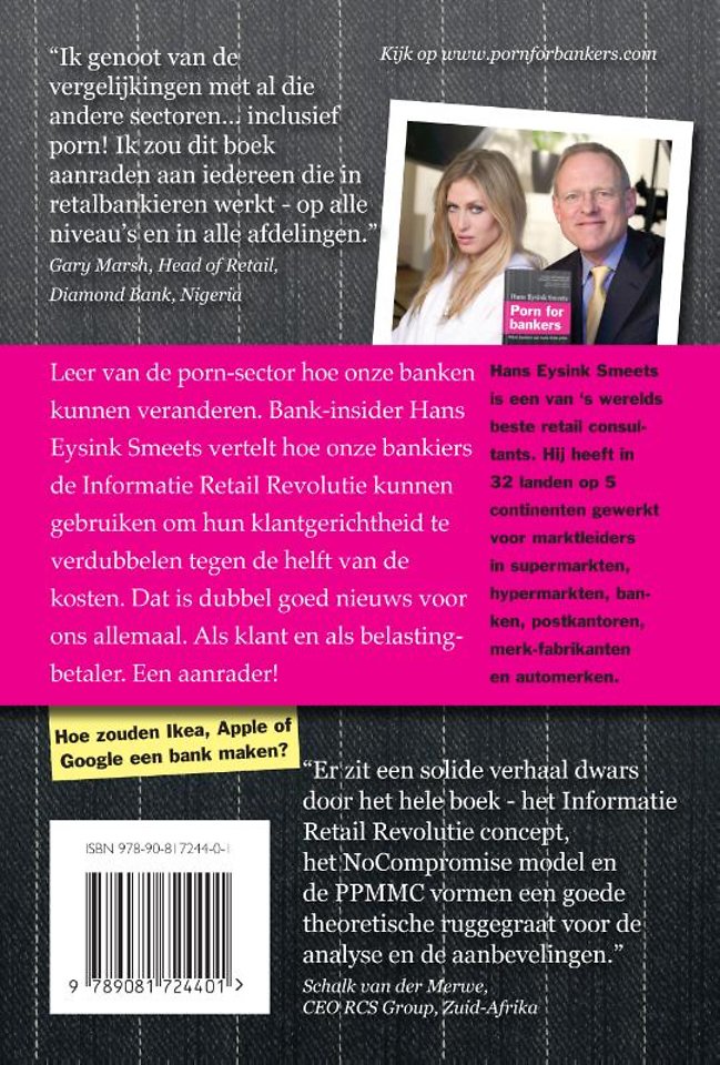 Meer over Hans Eysink SmeetsLeer van de porn-sector hoe onze banken kunnen veranderen. Bank-insider Hans Eysink Smeets vertelt hoe onze bankiers de Informatie Retail Revolutie kunnen gebruiken om hun klantgerichtheid te verdubbelen tegen de helft van de kosten. Dat is dubbel goed nieuws voor ons allemaal. Als klant en als belastingbetaler. Een aanrader! Hans Eysink Smeets is een van 's werelds beste retail consultants. Hij heeft in 32 landen op 5 continenten gewerkt voor marktleiders in supermarkten, hypermarkten, banken, postkantoren, merk-fabrikanten en automerken.