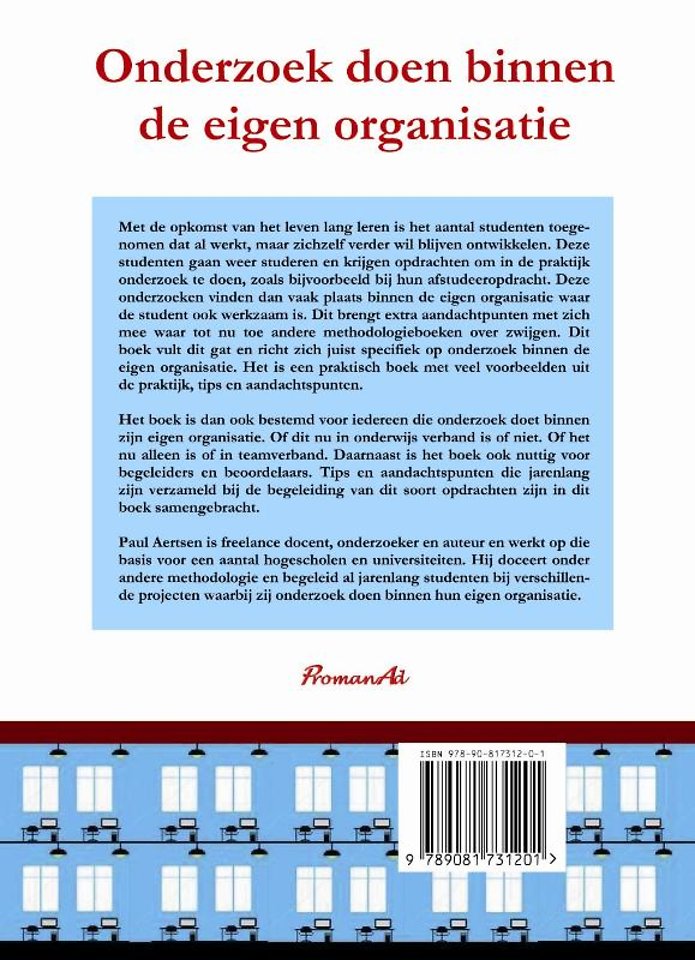 Met de opkomst van het leven lang leren is het aantal studenten toegenomen dat al werkt, maar zichzelf verder wil blijven ontwikkelen. Deze studenten gaan weer studeren en krijgen opdrachten om in de praktijk onderzoek te doen, zoals bijvoorbeeld bij hun afstudeeropdracht. Deze onderzoeken vinden dan vaak plaats binnen de eigen organisatie waar de student ook werkzaam is. Dit brengt extra aandachtpunten met zich mee waar tot nu toe andere methodologieboeken over zwijgen. Dit boek vult dit gat en richt zich juist specifiek op onderzoek binnen de eigen organisatie. Het is een praktisch boek met veel voorbeelden uit de praktijk, tips en aandachtspunten.