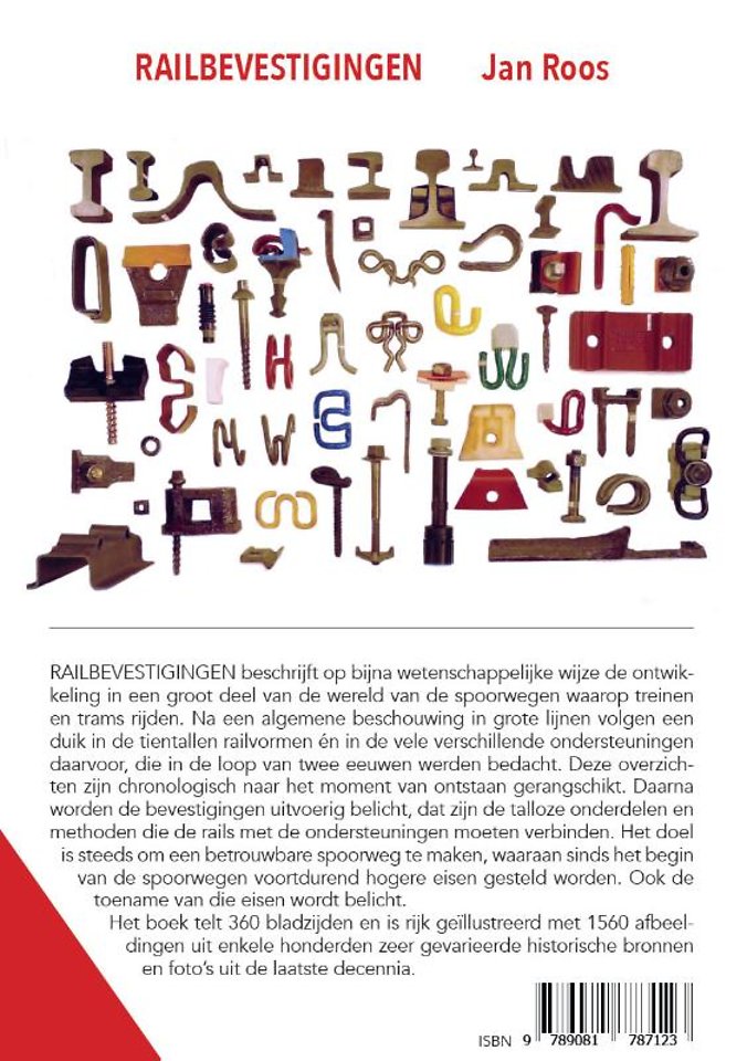 RAILBEVESTIGINGEN beschrijft op bijna wetenschappelijke wijze de ontwikkeling in een groot deel van de wereld van de spoorwegen waarop treinen en trams rijden. Na een algemene beschouwing in grote lijnen volgen een duik in de tientallen railvormen én in de vele ver-schillende ondersteuningen daarvoor, die in de loop van twee eeuwen werden bedacht. Deze overzichten zijn chronologisch naar het moment van ontstaan gerangschikt. Daarna worden de bevestigingen uitvoerig belicht, dat zijn de talloze onderdelen en methoden die de rails met de ondersteuningen moeten verbinden. Het doel is steeds om een betrouwbare spoor-weg te maken, waaraan sinds het begin van de spoorwegen voortdurend hogere eisen ge-steld worden. Ook de toename van die eisen wordt belicht.
