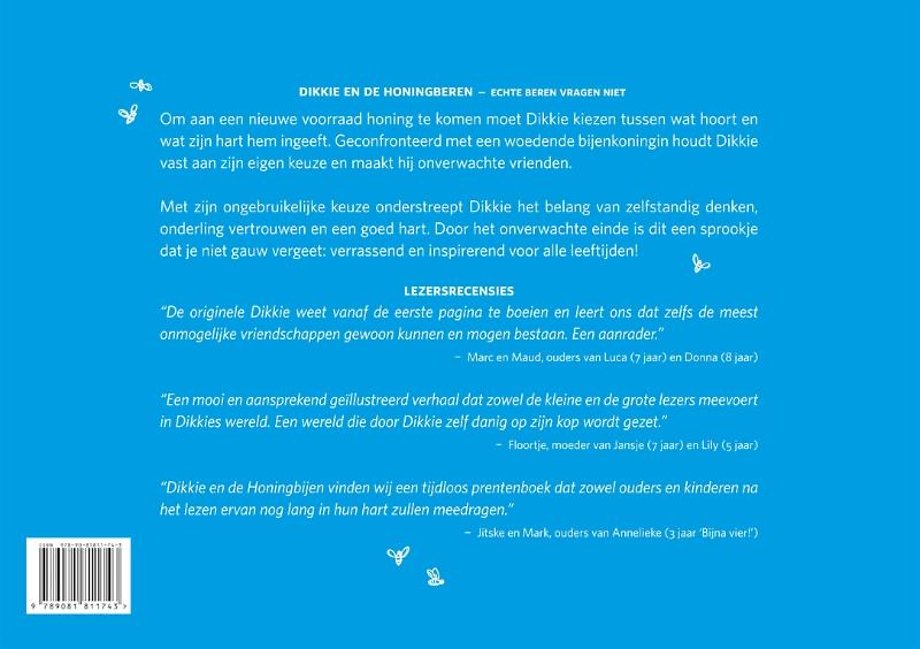 Dit voorleesboek neemt ouders en kinderen serieus in zowel tekst als tekening. Onze driejarige dochter wil het herhaaldelijk voorgelezen krijgen en is gefascineerd door de sleutelscène van het verhaal. Ook het liggende en grote formaat van het boek, met tekst op de ene pagina en illustraties op de andere pagina, is erg prettig. Zo kunnen de kinderen goed naar de prachtige tekeningen kijken, terwijl de tekst duidelijk en gemakkelijk leesbaar blijft. Dikkie en de Honingbijen vinden wij een tijdloos prentenboek dat zowel ouders en kinderen na het lezen ervan nog lang in hun hart zullen meedragen. (Jitske en Mark, ouders van Annelieke)