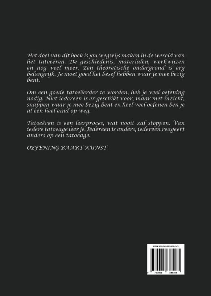 Het doel van dit boek is jou wegwijs maken in de wereld van het tatoeëren. De geschiedenis, materialen, werkwijzen en nog veel meer. Een theoretische ondergrond is erg belangrijk. Je moet goed het besef hebben waar je mee bezig bent.