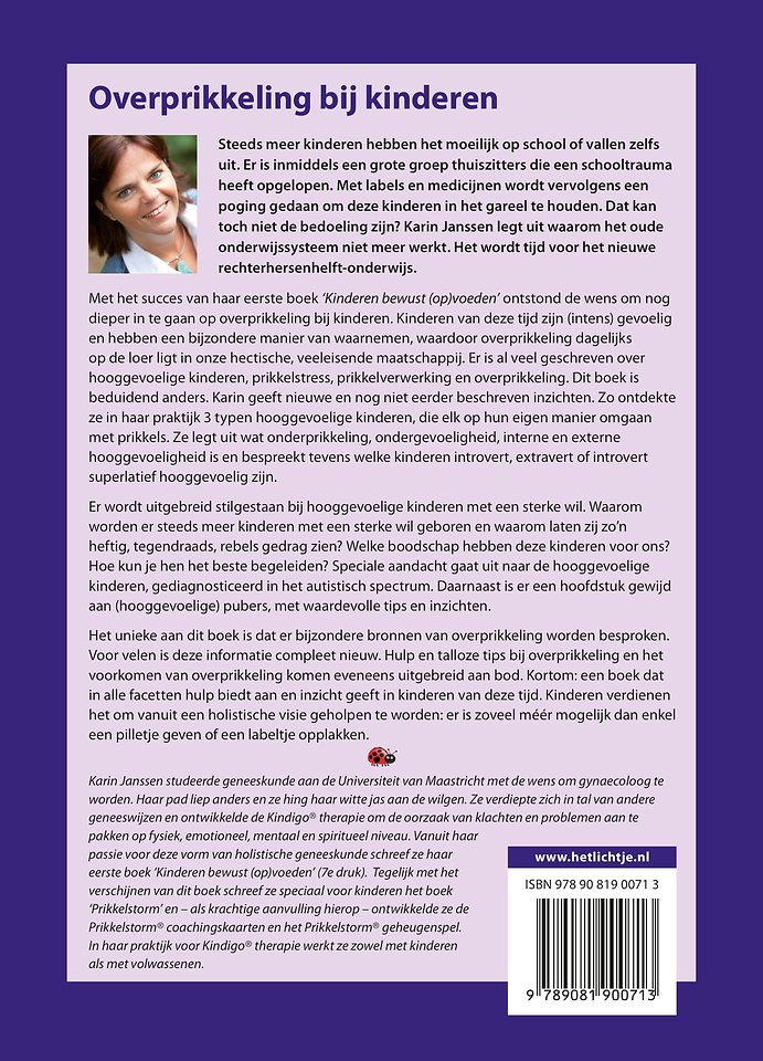 Het unieke aan dit boek is dat er bijzondere bronnen van overprikkeling worden besproken. Voor velen is deze informatie compleet nieuw. Hulp en talloze tips bij overprikkeling en het voorkomen van overprikkeling komen eveneens uitgebreid aan bod. Kortom: een boek dat in alle facetten hulp biedt aan en inzicht geeft in kinderen van deze tijd. Kinderen verdienen het om vanuit een holistische visie geholpen te worden: er is zoveel méér mogelijk dan enkel een pilletje geven of een labeltje opplakken.
