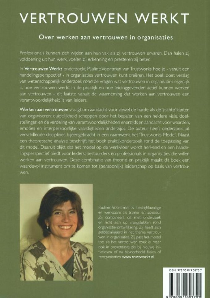 In 'Vertrouwen werkt' onderzoekt Pauline Voortman van Trustworks hoe u - vanuit een handelingsperspectief - in organisaties vertrouwen kunt creëren. Het boek doet verslag van wetenschappelijk onderzoek rond de vragen wat vertrouwen in organisaties eigenlijk is, hoe vertrouwen werkt in de praktijk en hoe leidinggevenden actief kunnen werken aan vertrouwen - dit laatste vanuit de waarneming dat werken aan vertrouwen een verantwoordelijkheid is van leiders.