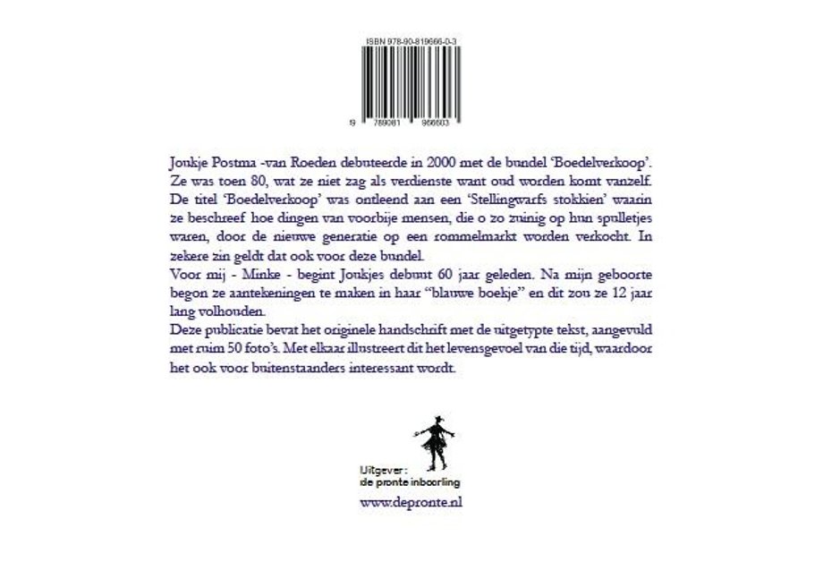 Joukje Postma -van Roeden debuteerde in 2000 met de bundel 'Boedelverkoop'. Ze was toen 80, wat ze niet zag als verdienste want oud worden komt vanzelf. De titel 'Boedelverkoop' was ontleend aan een 'Stellingwarfs stokkien' waarin ze beschreef hoe dingen van voorbije mensen, die o zo zuinig op hun spulletjes waren, door de nieuwe generatie op een rommelmarkt worden verkocht. In zekere zin geldt dat ook voor deze bundel.