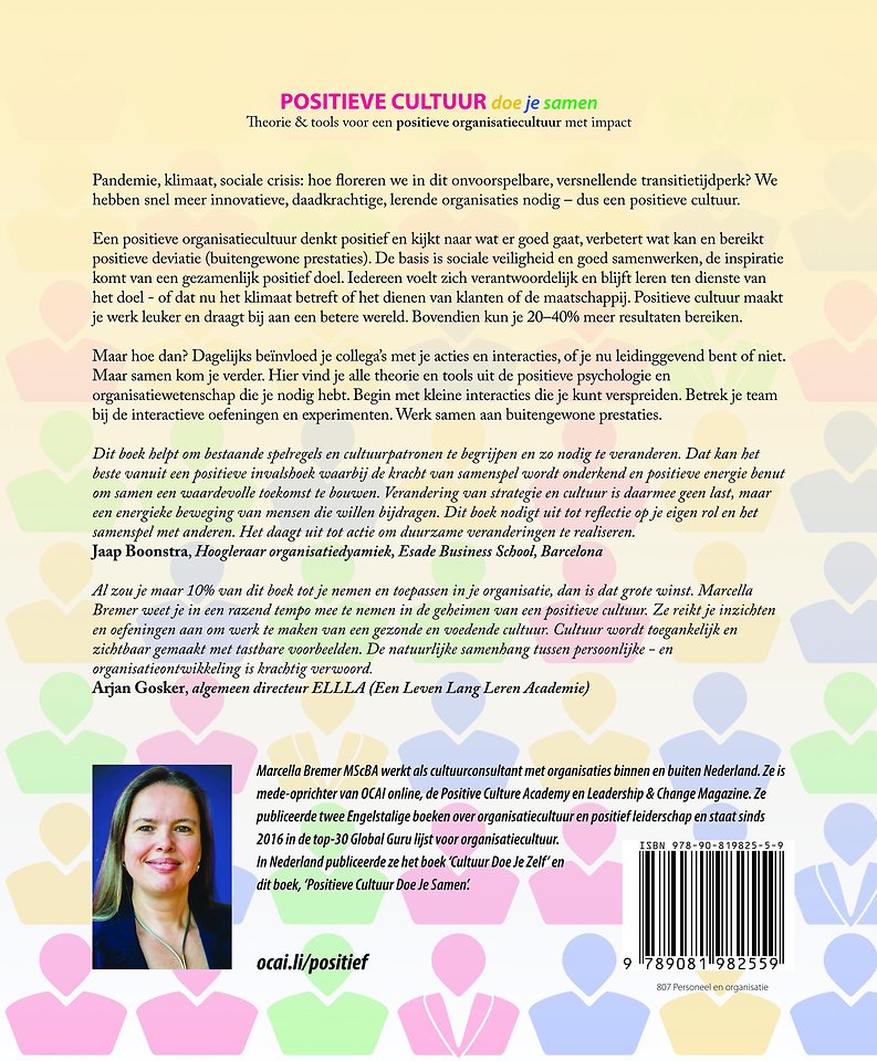 Een positieve organisatiecultuur denkt positief en kijkt naar wat er goed gaat, verbetert wat kan en bereikt positieve deviatie (buitengewone prestaties). De basis is sociale veiligheid en goed samenwerken, de inspiratie komt van een gezamenlijk positief doel. Iedereen voelt zich verantwoordelijk en blijft leren ten dienste van het doel - of dat nu het klimaat betreft of het dienen van klanten of de maatschappij. Positieve cultuur maakt je werk leuker en draagt bij aan een betere wereld. Bovendien kun je 20-40% meer resultaten bereiken.