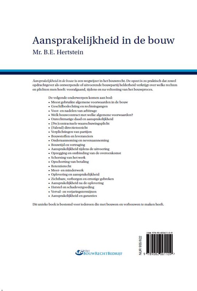 'Aansprakelijkheid in de bouw' is een wegwijzer in het bouwrecht. De opzet is zo praktisch dat zowel opdrachtgever als ontwerpende of uitvoerende bouwpartij helderheid verkrijgt over welke rechten en plichten men heeft: voorafgaand, tijdens en na voltooiing van het bouwproces.