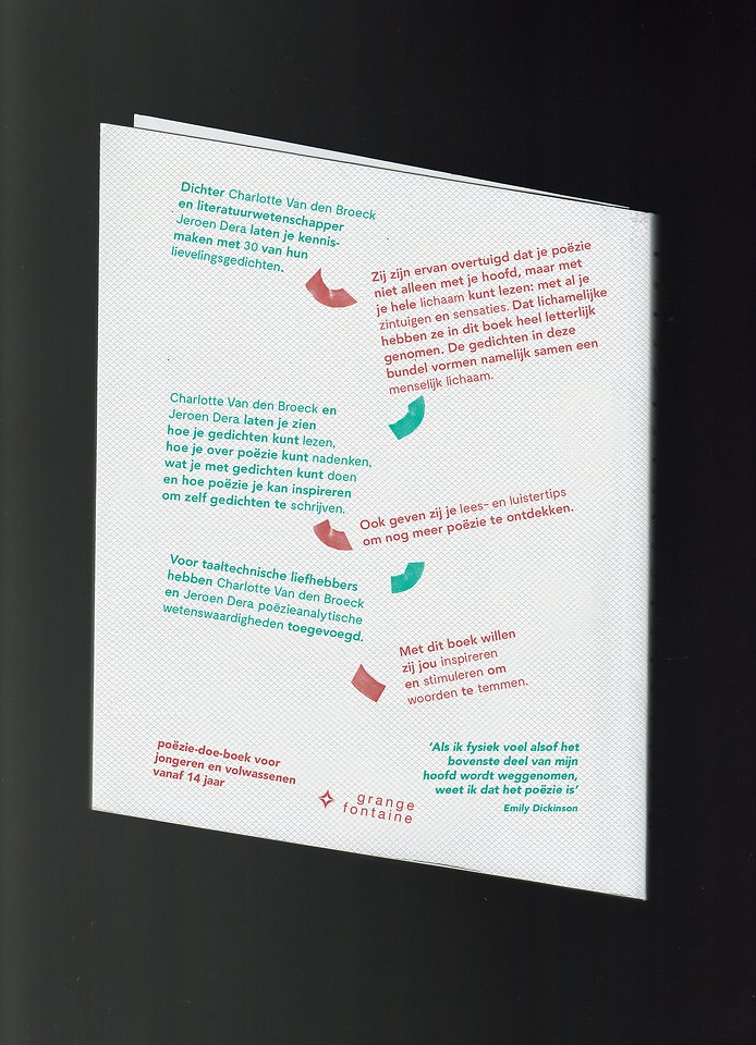 Dichter en performer Charlotte Van den Broeck en literatuurwetenschapper Jeroen Dera zijn ervan overtuigd dat je poëzie niet alleen met je hoofd, maar met je hele lichaam leest, met al je zintuigen en sensaties. Dat lichamelijke hebben ze heel letterlijk genomen: ieder gedicht is gekoppeld aan een lichaamsdeel. Aan de hand van inspirerende lees-, denk-, doe- en schrijf-invalshoeken en meer ga je op poëtische avontuur.