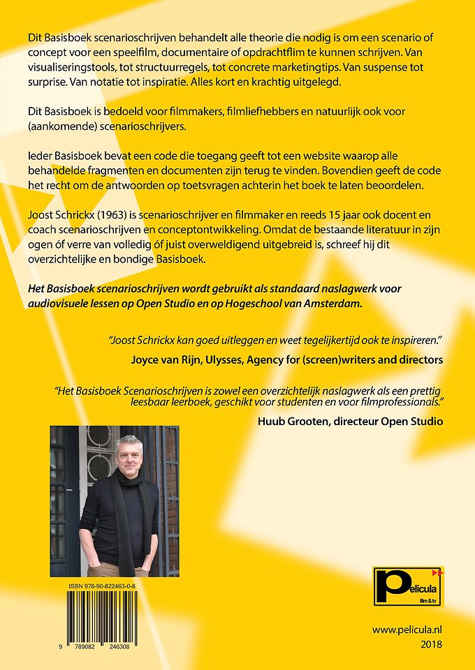 Joost Schrickx (1963) is scenarioschrijver en filmmaker en reeds 15 jaar ook docent en coach scenarioschrijven en conceptontwikkeling. Omdat de bestaande literatuur in zijn ogen óf verre van volledig óf juist overweldigend uitgebreid is, schreef hij dit overzichtelijke en bondige Basisboek.