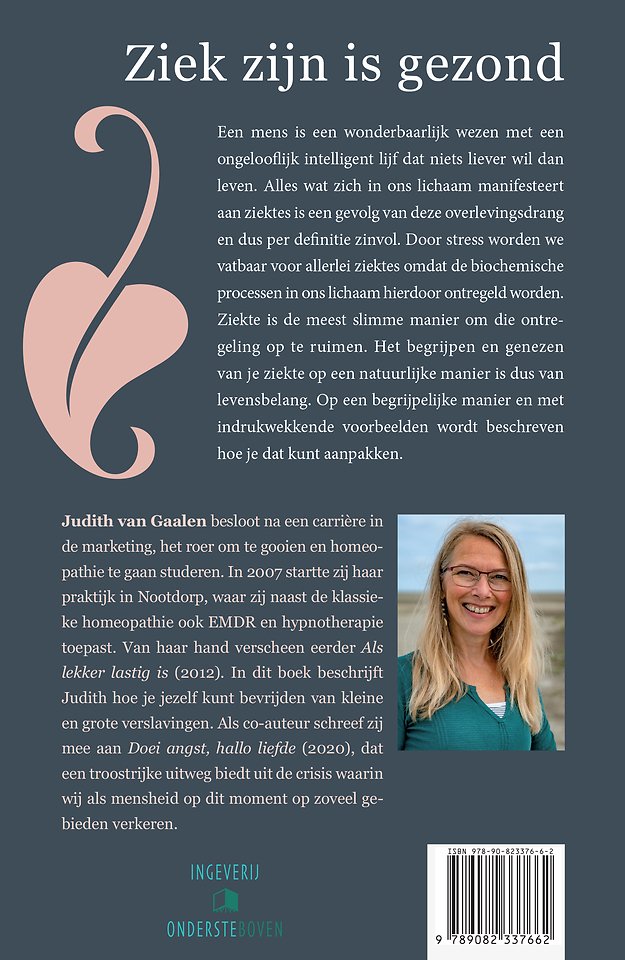 Judith van Gaalen besloot na een carrière in de marketing, het roer om te gooien en homeopathie te gaan studeren. In 2007 startte zij haar praktijk in Nootdorp, waar zij naast de klassieke homeopathie ook EMDR en hypnotherapie toepast. Van haar hand verscheen eerder ‘Als lekker lastig is’ (2012). In dit boek beschrijft Judith hoe je jezelf kunt bevrijden van kleine en grote verslavingen. Als co-auteur schreef zij mee aan ‘Doei angst, hallo liefde’ (2020), dat een troostrijke uitweg biedt uit de crisis waarin wij als mensheid op dit moment op zoveel gebieden verkeren.