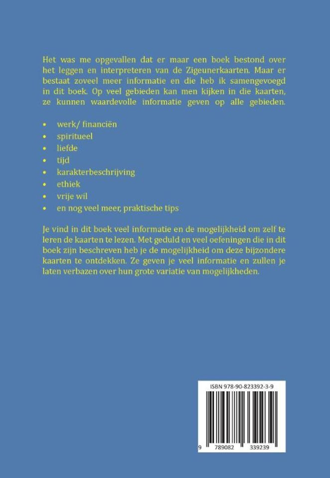 Het was me opgevallen dat er maar een boek bestond over het leggen en interpreteren van de Zigeunerkaarten. Maar er bestaat zoveel meer informatie en die heb ik samengevoegd in dit boek. Op veel gebieden kan men kijken in die kaarten, ze kunnen waardevolle informatie geven op alle gebieden.