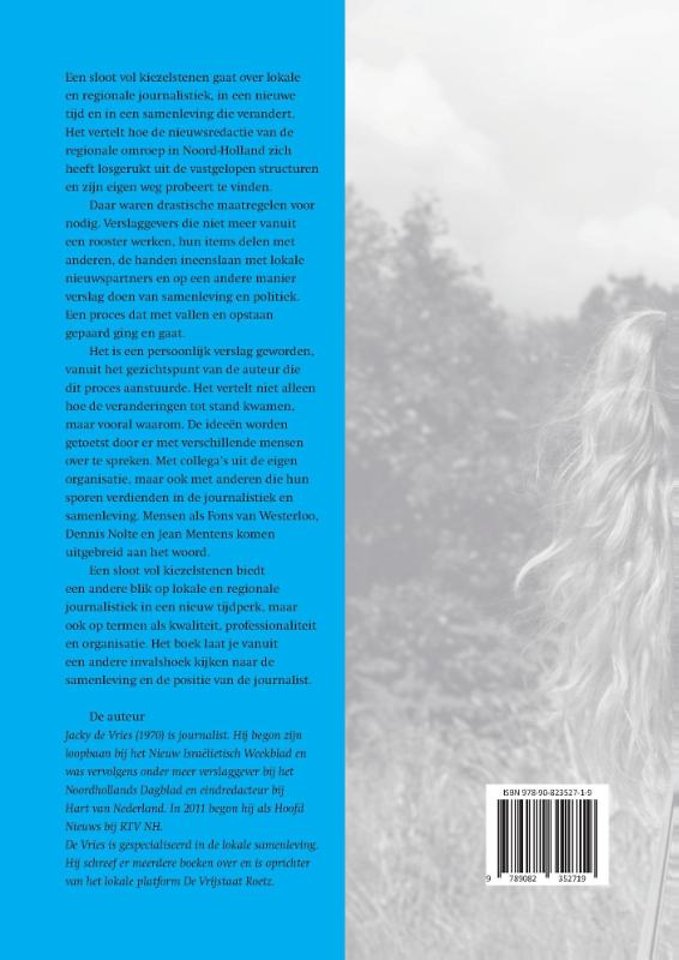 Een sloot vol kiezelstenen biedt een andere blik op lokale en regionale journalistiek in een nieuw tijdperk, maar ook op termen als kwaliteit, professionaliteit en organisatie. Het boek laat je vanuit een andere invalshoek kijken naar de samenleving en de positie van de journalist.Een sloot vol kiezelstenen gaat over lokale en regionale journalistiek, in een nieuwe tijd en in een samenleving die verandert. Het vertelt hoe de nieuwsredactie van de regionale omroep in Noord-Holland zich heeft losgerukt uit de vastgelopen structuren en zijn eigen weg probeert te vinden.