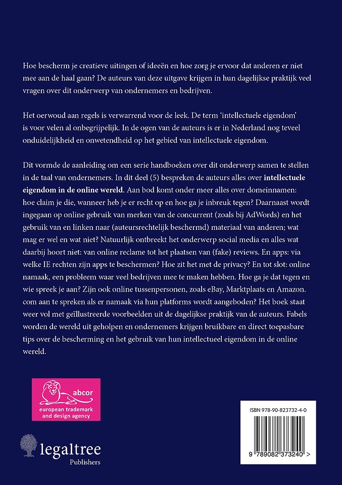 Dit vijfde deel van IE in Bedrijf is net als de andere delen geschreven in de inmiddels bekende begrijpelijke taal. Het staat weer vol met aansprekende voorbeelden (met illustraties) uit de dagelijkse praktijk. De auteurs, Marjolein Driessen (advocaat/partner bij Legaltree en IE-specialist) en Theo-Willem van Leeuwen (merkenjurist en eigenaar van merkenbureau Abcor), zijn er opnieuw in geslaagd juridische expertise te vertalen in direct bruikbare en toepasbare tips voor ondernemers die willen weten welke rol intellectuele eigendomsrechten spelen in de online wereld. Een hoofdstuk over het zeer actuele onderwerp privacy is geschreven door gastauteur Bieneke Braat, een expert op dit gebied en eveneens advocaat/partner bij Legaltree.