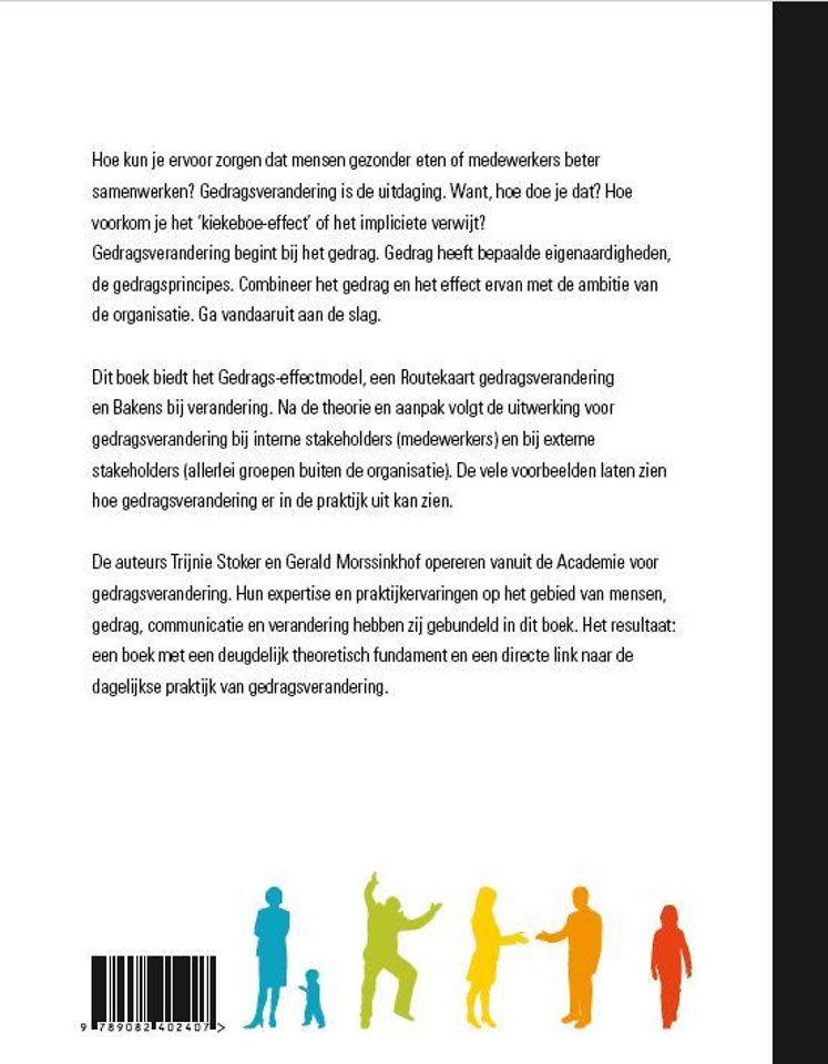 Meer over de auteursHoe kun je ervoor zorgen dat mensen gezonder eten of medewerkers beter samenwerken? Gedragsverandering is de uitdaging. Want, hoe doe je dat? Hoe voorkom je het 'kiekeboe-effect' of het impliciete verwijt?Gedragsverandering begint bij het gedrag. Gedrag heeft bepaalde eigenaardigheden, de gedragsprincipes. Combineer het gedrag en het effect ervan met de ambitie van de organisatie. Dit boek biedt het Gedrags-effectmodel, een Routekaart gedragsverandering en Bakens bij verandering. Na de theorie en aanpak volgt de uitwerking voor gedragsverandering bij interne stakeholders (medewerkers) en bij externe stakeholders (allerlei groepen buiten de organisatie). De vele voorbeelden laten zien hoe gedragsverandering er in de praktijk uit kan zien.De auteurs Trijnie Stoker en Gerald Morssinkhof opereren vanuit de Academie voor gedragsverandering. Hun expertise en praktijkervaringen op het gebied van mensen, gedrag, communicatie en verandering hebben zij gebundeld in dit boek. Het resultaat: een boek met een deugdelijk theoretisch fundament en een directe link naar de dagelijkse praktijk van gedragsverandering.