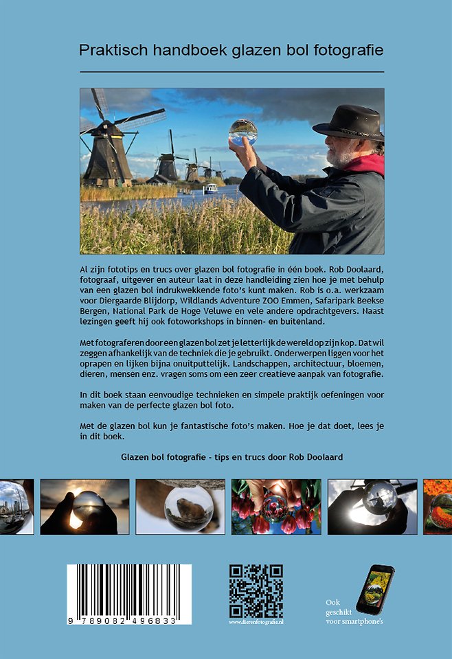 Al zijn fototips en trucs over glazen bol fotografie in één boek. Rob Doolaard, fotograaf, uitgever en auteur laat in deze handleiding zien hoe je met behulp van een glazen bol indrukwekkende foto’s kunt maken. Rob is o.a. werkzaam voor Diergaarde Blijdorp, Wildlands Adventure ZOO Emmen, Safaripark Beekse Bergen, National Park de Hoge Veluwe en vele andere opdrachtgevers. Naast lezingen geeft hij ook fotoworkshops in binnen- en buitenland.