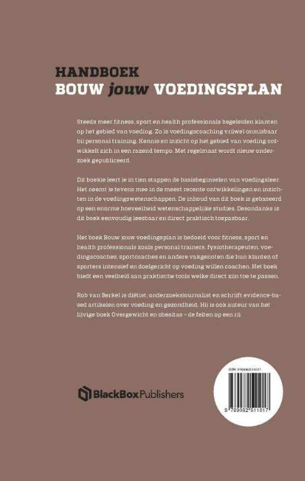 Het boek Bouw jouw voedingsplan is bedoeld voor fitness, sport en health professionals zoals personal trainers, fysiotherapeuten, voedingscoaches, sportcoaches en andere vakgenoten die hun klanten of sporters intensief en doelgericht op voeding willen coachen. Het boek biedt een veelheid aan praktische tools welke direct zijn toe te passen.