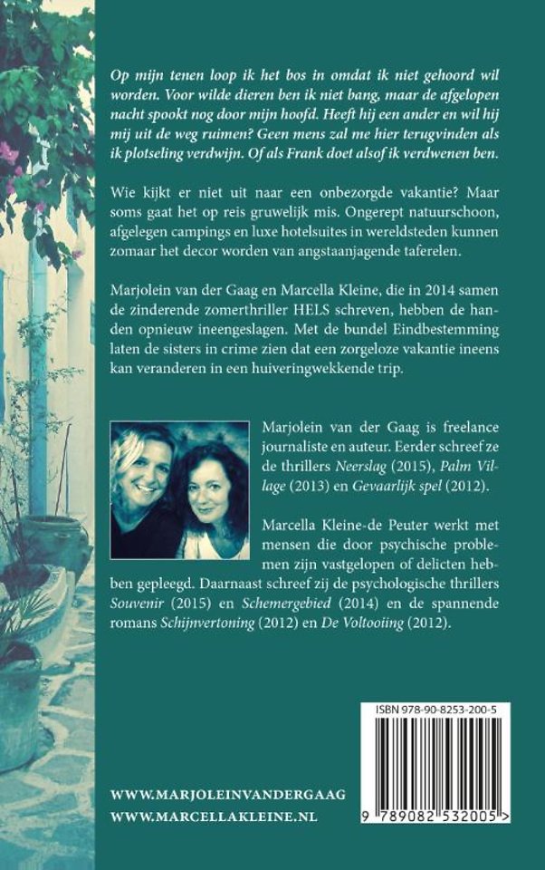 Marjolein van der Gaag en Marcella Kleine, die in 2014 samen de zinderende zomerthriller HELS schreven, hebben de handen opnieuw ineengeslagen. Met de bundel Eindbestemming laten de sisters in crime zien dat een zorgeloze vakantie ineens kan veranderen in een huiveringwekkende trip.