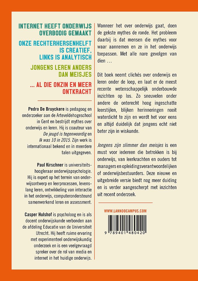 Jongens zijn slimmer dan meisjes is een must voor iedereen die betrokken is bij onderwijs, van leerkrachten en ouders tot managers en opleidingsverantwoordelijken of onderwijsbestuurders. Deze nieuwe en uitgebreide versie biedt nog meer duiding en is verder aangescherpt met inzichten uit recent onderzoek.