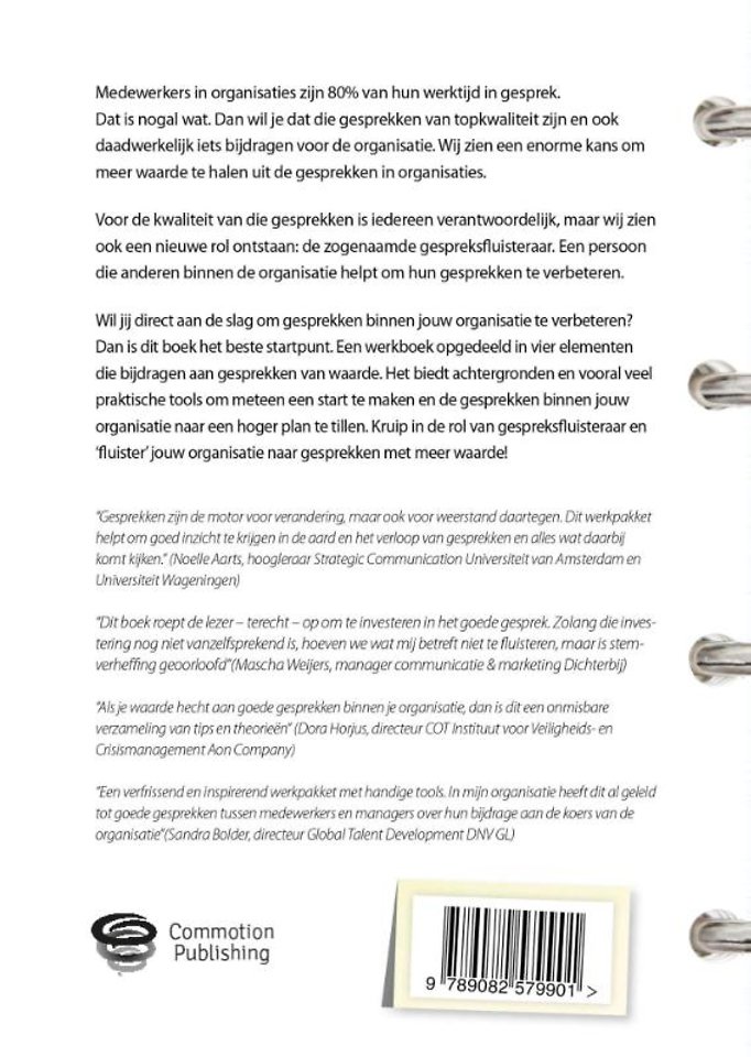 Wil jij direct aan de slag om gesprekken binnen jouw organisatie te verbeteren? Dan is dit boek het beste startpunt. Een werkboek opgedeeld in vier elementen die bijdragen aan gesprekken van waarde. Het biedt achtergronden en vooral veel praktische tools om meteen een start te maken en de gesprekken binnen jouw organisatie naar een hoger plan te tillen. Kruip in de rol van gespreksfluisteraar en ‘fluister’ jouw organisatie naar gesprekken met meer waarde!