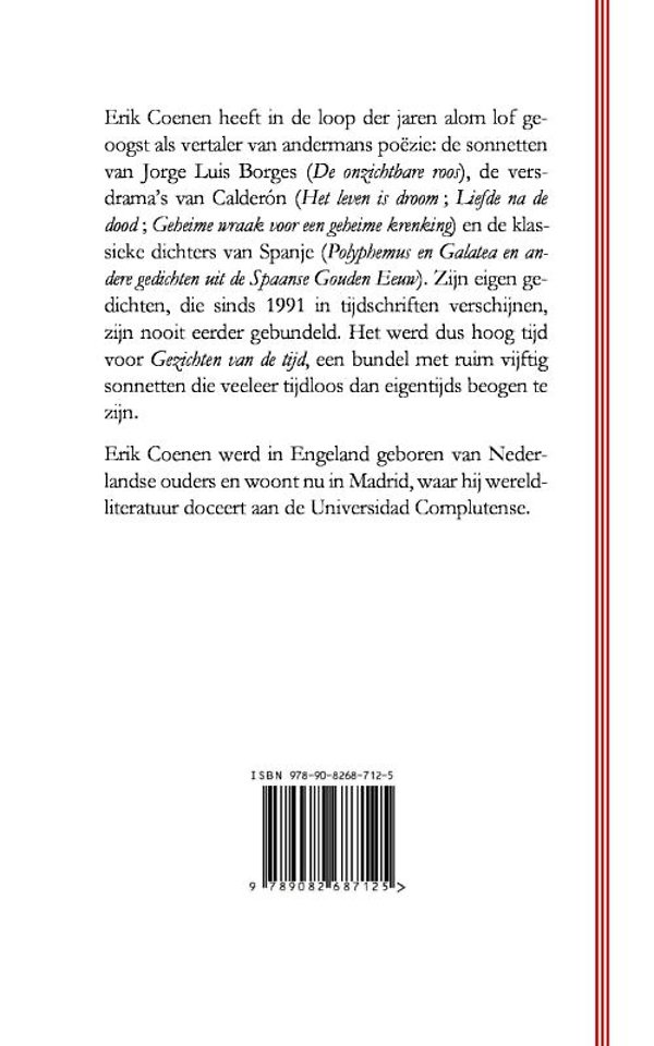 Erik Coenen heeft in de loop der jaren alom lof geoogst als vertaler van andermans poëzie: de sonnetten van Jorge Luis Borges (De onzichtbare roos), de vers-drama's van Calderón (Het leven is droom; Liefde na de dood; Geheime wraak voor een geheime krenking) en de klassieke dichters van Spanje (Polyphemus en Galatea en andere gedichten uit de Spaanse Gouden Eeuw). Zijn eigen gedichten, die sinds 1991 in tijdschriften verschijnen, zijn nooit eerder gebundeld. Het werd dus hoog tijd voor Gezichten van de tijd, een bundel met ruim vijftig sonnetten die veeleer tijdloos dan eigentijds beogen te zijn.