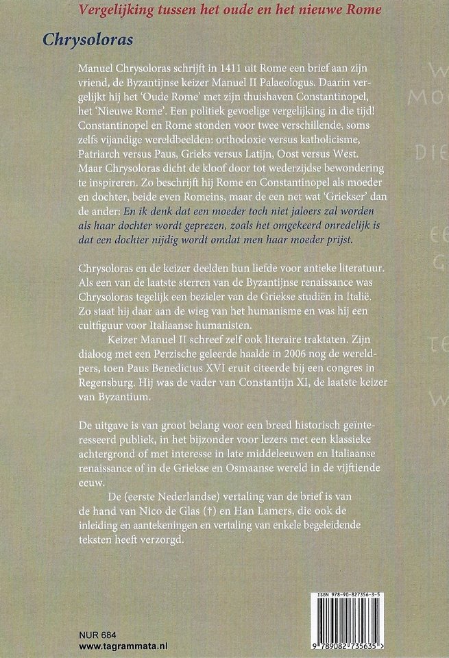 Manuel Chrysoloras schrijft in 1411 uit Rome een lange brief aan zijn vriend, de Byzantijnse keizer Manuel II Palaeologus. Daarin vergelijkt hij het 'Oude Rome' met zijn thuishaven Constantinopel, het 'Nieuwe Rome'. Een politiek gevoelige vergelijking in die tijd! Constantinopel en Rome stonden voor twee verschillende, soms zelfs vijandige wereldbeelden: orthodoxie versus katholicisme, Patriarch versus Paus, Grieks versus Latijn, Oost versus West. Maar Chrysoloras dicht de kloof door tot wederzijdse bewondering te inspireren. Zo beschrijft hij Rome en Constantinopel als moeder en dochter, beide even Romeins, maar de een net wat 'Griekser' dan de ander: En ik denk dat een moeder toch niet jaloers zal worden als haar dochter wordt geprezen, zoals het omgekeerd onredelijk is dat een dochter nijdig wordt omdat men haar moeder prijst.
