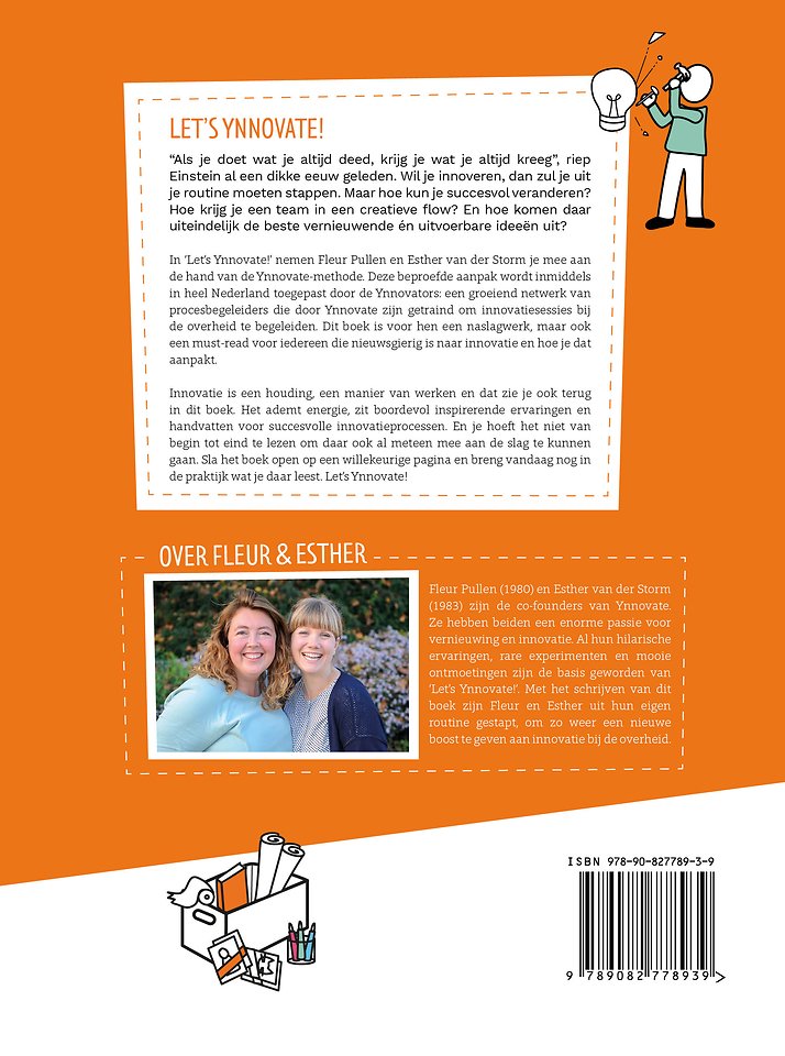 In ‘Let’s Ynnovate!’ nemen Fleur Pullen en Esther van der Storm je mee aan de hand van de Ynnovate-methode. Deze beproefde aanpak wordt inmiddels in heel Nederland toegepast door de Ynnovators: een groeiend netwerk van procesbegeleiders die door Ynnovate zijn getraind om innovatiesessies bij de overheid te begeleiden. Dit boek is voor hen een naslagwerk, maar ook een must-read voor iedereen die nieuwsgierig is naar innovatie en hoe je dat aanpakt.