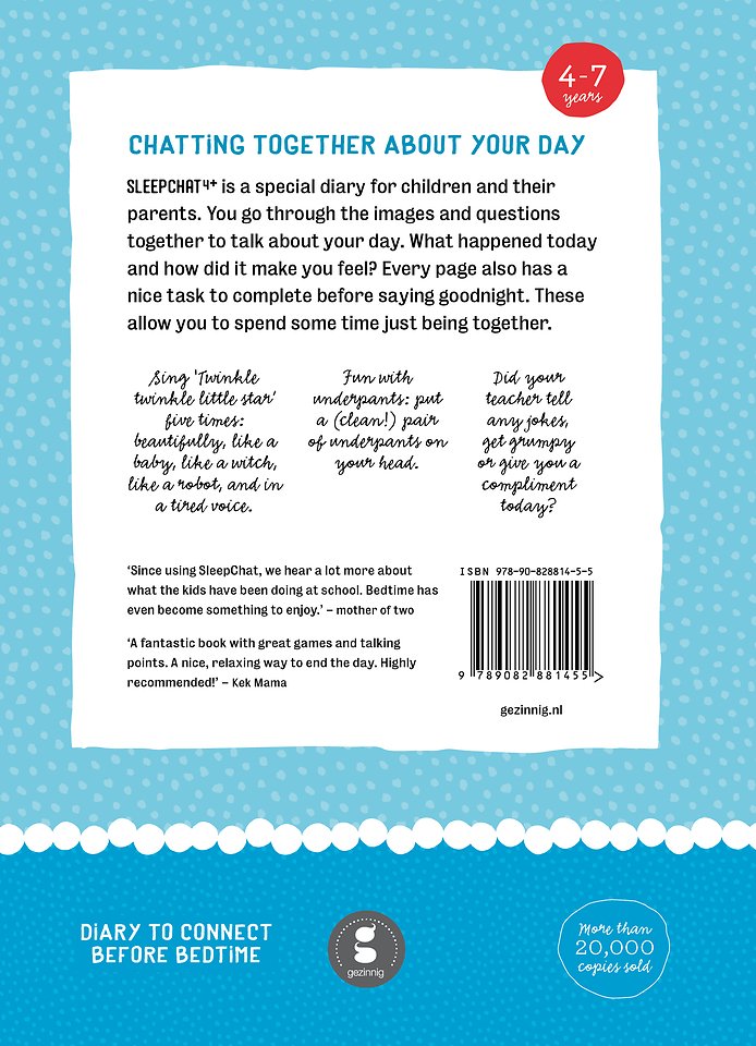 Sleepchat 4+ part one is a special diary for children and their parents to connect before bedtime. You go through the images and questions together to talk about your day. What happened today and how did it make you feel? Every page also has a nice task to complete before saying goodnight. These allow you to spend some time just being together. Suitable for 4 - 7 years.