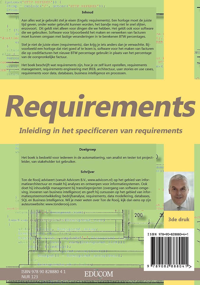 • Hoofdstuk 14 gaat in op het toepassen van requirements. Onder andere hoe het hebben van een complete set van requirements een enorme hulp kan zijn bij de aanschaf van standaardsoftware.
