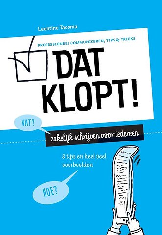 In 'Dat klopt!' vind je 8 concrete tips waarmee je probleemloos duidelijk, efficiënt en klantgericht schrijft. De tips zijn kort en bondig geschreven, zonder theoretisch geneuzel.