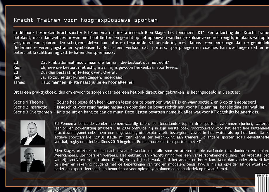 In dit boek bespreken krachtsporter Ed Fennema en prestatiecoach Rien Slager het fenomeen ‘KT’. Een afkorting die ‘Kracht Trainen’ betekent, maar dan wel geschreven met hoofdletters en gericht op het opbouwen van hoog-explosieve neurostrength, in plaats van op het vergroten van spieren.