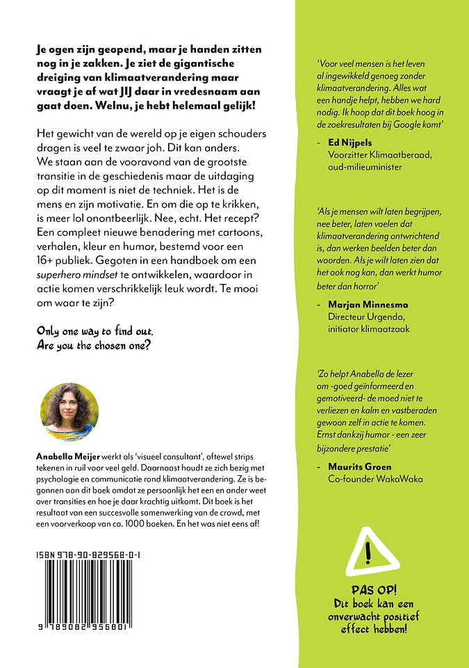 Het gewicht van de wereld op je eigen schouders dragen is veel te zwaar joh. Dit kan anders. We staan aan de vooravond van de grootste transitie in de geschiedenis maar de uitdaging op dit moment is niet de techniek. Het is de mens en zijn motivatie. En om die op te krikken, is meer lol onontbeerlijk. Nee, echt. Het recept? Een compleet nieuwe benadering met cartoons, verhalen, kleur en humor, bestemd voor een 16+ publiek. Gegoten in een handboek om een superhero mindset te ontwikkelen, waardoor in actie komen verschrikkelijk leuk wordt. Te mooi om waar te zijn?