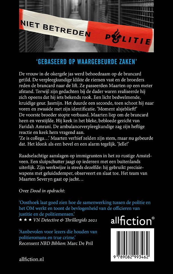 De vrouw in de okergele jas werd behoedzaam op de brancard getild. De verpleegkundige klikte de riemen vast en de twee broeders reden de brancard naar de lift. Ze passeerden Maarten op een meter afstand. Terwijl zijn gedachten bij de dader waren realiseerde hij zich opeens dat hij iets bekends rook. Een licht bedwelmende, kruidige geur. Jasmijn. Het duurde een seconde, toen schoot hij naar voren en zwaaide met zijn identificatie. ‘Moment alsjeblieft!’