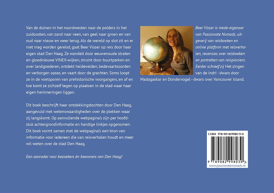 Van de duinen in het noordwesten naar de polders in het zuidoosten, van zand naar veen, van geel naar groen en van oud naar nieuw en weer terug. Als de wereld op slot zit en er niet mag worden gereisd, gaat Beer Visser op reis door haar eigen stad Den Haag. Ze wandelt door eeuwenoude straten en gloednieuwe VINEX-wijken, struint door buurtparken en over landgoederen, ontdekt heidevelden, bedevaartsoorden en verborgen oases, en vaart door de grachten. Soms loopt ze in de voetsporen van prehistorische voorgangers, en af en toe komt ze zichzelf tegen op plaatsen in de stad waar haar eigen herinneringen liggen. Dit boek beschrijft haar ontdekkingstochten door Den Haag, aangevuld met wetenswaardigheden over de plekken waar zij langskomt. Op aanvullende webpagina’s zijn per hoofdstuk achtergrondinformatie en handige linkjes opgenomen. Dit boek vormt samen met de webpagina’s een bron van informatie voor iedereen die van reisverhalen houdt en meer wil weten over de stad Den Haag.