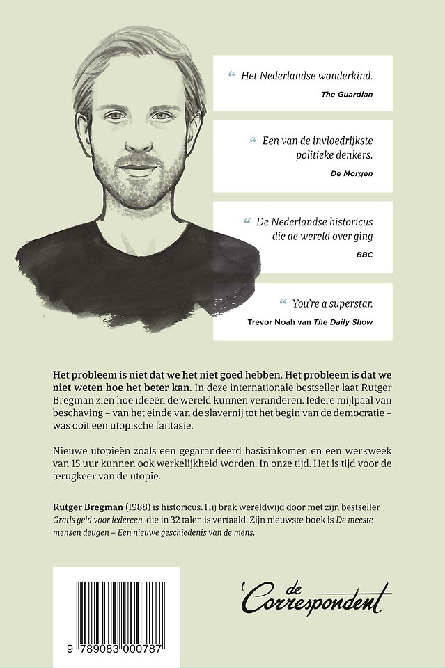 Meer over Rutger BregmanHet probleem is niet dat we het niet goed hebben. Het probleem is dat we niet weten hoe het beter kan. In deze internationale bestseller laat Rutger Bregman zien hoe ideeën de wereld kunnen veranderen. Iedere mijlpaal van beschaving – van het einde van de slavernij tot het begin van de democratie – was ooit een utopische fantasie. Nieuwe utopieën zoals een gegarandeerd basisinkomen en een werkweek van vijftien uur kunnen ook werkelijkheid worden. In onze tijd.