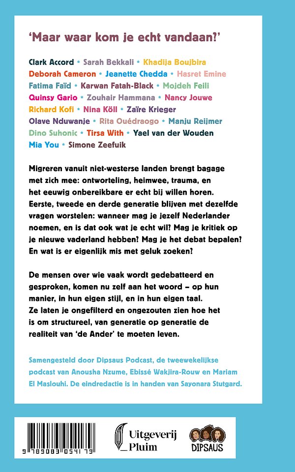Met bijdragen van kunstenaar en anti-racisme activist Quinsy Gario, scenarioschrijver Manju Reijmer, media- en cultuurwetenschapper Nina Köll, schrijver en visagist Clark Accord, case-worker voor mensenrechten Sarah Bekkali, schrijver en activist Mojdeh Feili, schrijver en antivalidisme-activist Jeanette Chedda, kunstenaar, curator en podcaster Richard Kofi, moeder, echtgenote, vechter en overlever Khadija Boujbira, schrijver en cultureel programmamaker Simone Zeefuik, jurist, activist en politica Olave Nduwanje, spoken-word artiest en activist Tirsa With, queer activist Dino Suhonic, dichter, recensent en onderzoeker Mia You, schrijver, fotograaf en historicus Hasret Emine, journalist en spoken word artiest Zaïre Krieger, blogger en social cultureel ondernemer Deborah Cameron, historicus Karwan Fatah-Black, schrijver en uitgever Yael van der Wouden, onderzoeker en curator Rita Ouédraogo, socioloog Zouhair Hammana, cultuurhistoricus Nancy Jouwe en raadslid Fatima Faïd.