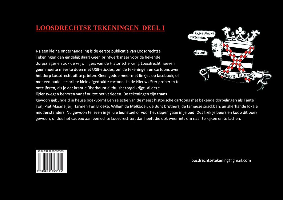 Na een kleine onderhandeling is de eerste publicatie van Loosdrechtse Tekeningen dan eindelijk daar! Geen printwerk meer voor de bekende dorpsslager en ook de vrijwilligers van de Historische Kring Loosdrecht hoeven geen moeite meer te doen met USB-stickies, om de tekeningen en cartoons over het dorp Loosdrecht uit te printen. Geen gedoe meer met linkjes op facebook, of met een oude leesbril te klein afgedrukte cartoons in de Nieuws Ster proberen te ontcijferen, als je dat krantje überhaupt al thuisbezorgd krijgt. Al deze lijdenswegen behoren vanaf nu tot het verleden. De tekeningen zijn thans gewoon gebundeld in heuse boekvorm! Een selectie van de meest historische cartoons met bekende dorpelingen als Tante Ton, Piet Masmeijer, Harmen Ten Broeke, Willem de Melkboer, de Bunt brothers, de fameuze snackbars en allerhande lokale middenstanders. Nu gewoon te lezen in je luie leunstoel of voor het slapen gaan in je bed. Dus trek je beurs en koop dit boek gewoon, of doe het cadeau aan een echte Loosdrechter, dan heeft die ook weer iets om naar te kijken en te lachen.